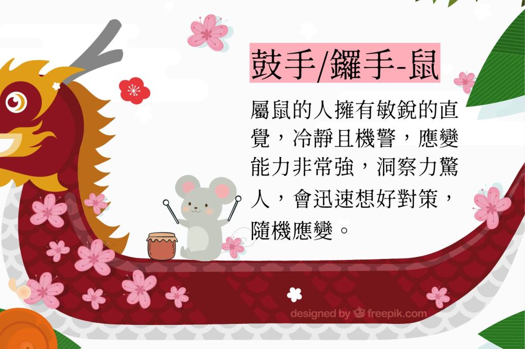 鼓手或鑼手,藉由龍鼓手的擊鼓聲,提振全隊的士氣,是龍舟比賽中重量級的靈魂人物,屬鼠的人具有敏銳的直覺,冷靜且機警,隨機應變的能力非常強,洞察力十分驚人,會迅速想好對策,隨時變換。