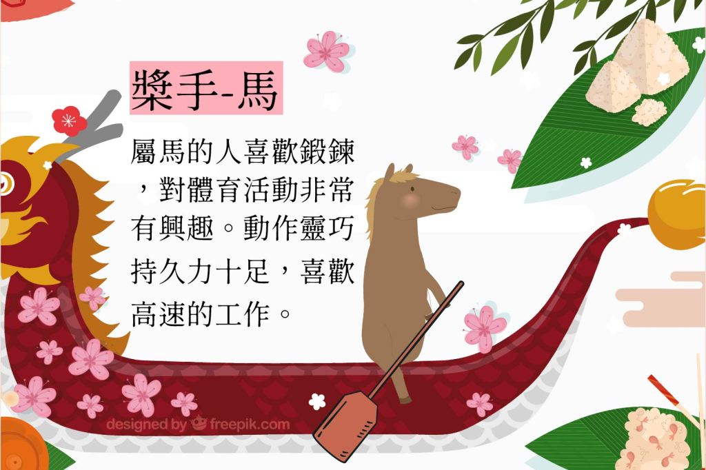 槳手,龍船力量的來源,以安全和熟練為主。屬馬的人喜歡鍛鍊,對於各式各樣的體育活動都非常有興趣,動作靈巧,反應迅速,持久力十足,喜愛高速的工作,可以同時做許多事情。