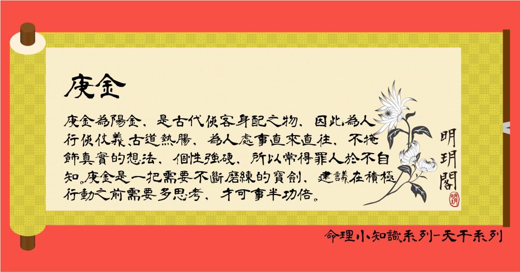 庚金為陽金,是冷冽的金屬器具,堅硬且形狀不會隨意改變,象徵物為『刀劍』。刀劍是古代俠客身配之物,因此庚金的人重義氣,好管閒事,極其討厭虛偽之人,有著路見不平拔刀相助,受人點滴之恩必當湧泉相報的『熱血俠義心腸』。處世是非分明,絕不輕言偏私袒護,且能言善辯、口才極佳,但字裡行間刀刀見骨,常常處於得罪於人而不自知的狀態,也因此容易樹敵。