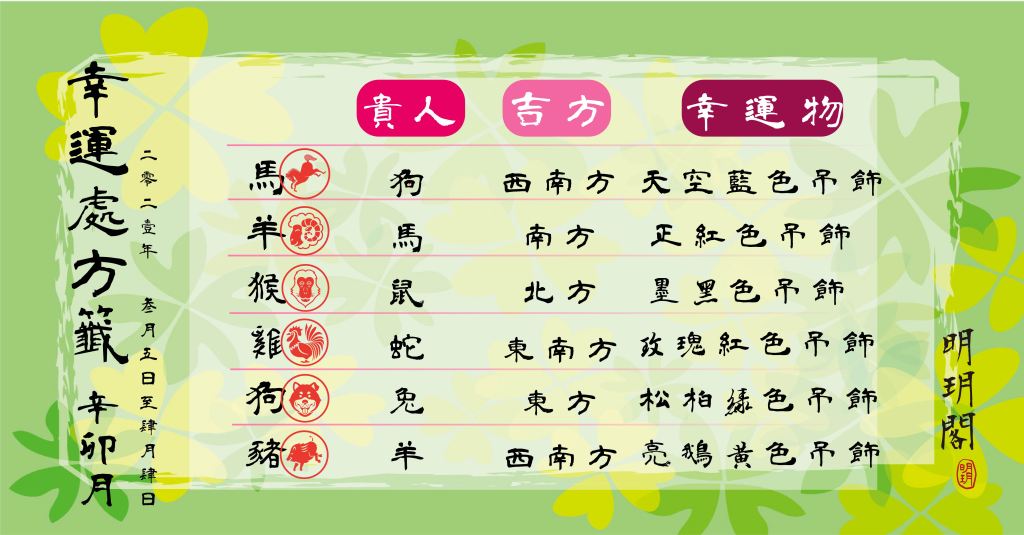 天氣在寒冷與溫暖之間來來回回,不知道你的心情是否也跟著上下浮動呢?春日的季節就是這樣變化多端,許多事情總不在自己的計劃中。我們雖然不能掌控每一件事都在自己的想法之中,但還是可以在生活中找尋一些小小的幸運,讓自己更有福氣啦~所以客倌看過來,掌握一下這個月你的貴人、吉方以及幸運物吧!