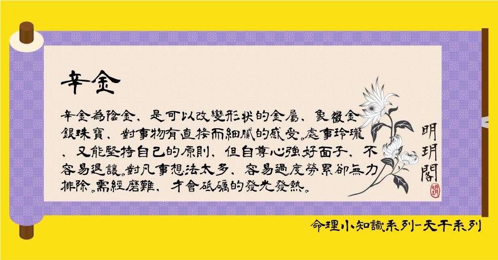 辛金為陰金,是可以改變形狀的金屬,象徵『金銀珠寶』。金銀珠寶的特性,對冷熱反應快速,因此辛金的人對事、物的感受往往是直接而細膩,有著自己獨特的想法,對各方面的人、事觀察細膩又乾脆,不管做什麼事都很得要領,善於變通;相較於乙木身段柔軟,辛金的人在處世上不但八面玲瓏,還可以堅持自己的原則。但時常因為自尊心強、太好面子,對於自己的立場過於堅持,不輕易退讓,容易「贏了面子,輸了裏子」。